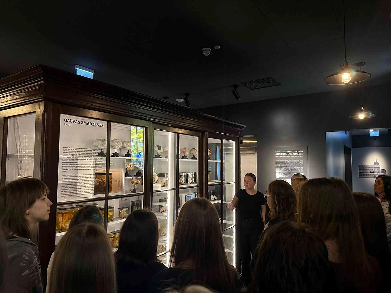 Tālāk devāmies uz RSU Anatomijas muzeju, kur mūs gaidīja gan skeleti un orgāni, gan unikāli vēsturiski eksponāti, kas ļāva ieraudzīt cilvēka ķermeni no pavisam cita skatpunkta. Mēs iedziļinājāmies cilvēka organisma uzbūvē un tā sarežģītībā, kā arī atklājām, cik nozīmīga bijusi medicīnas attīstība.