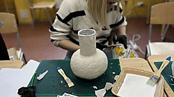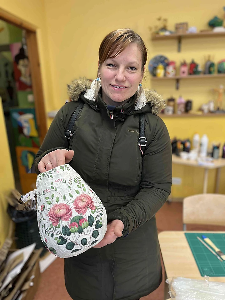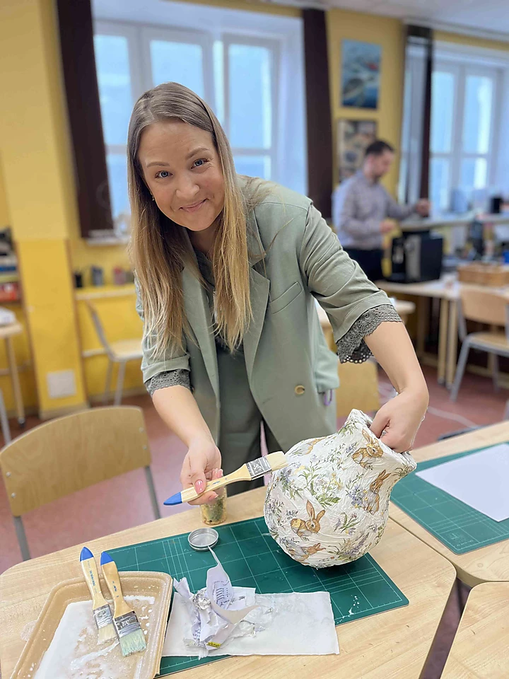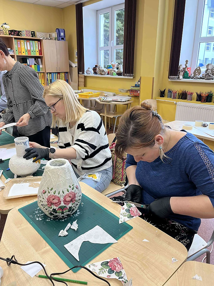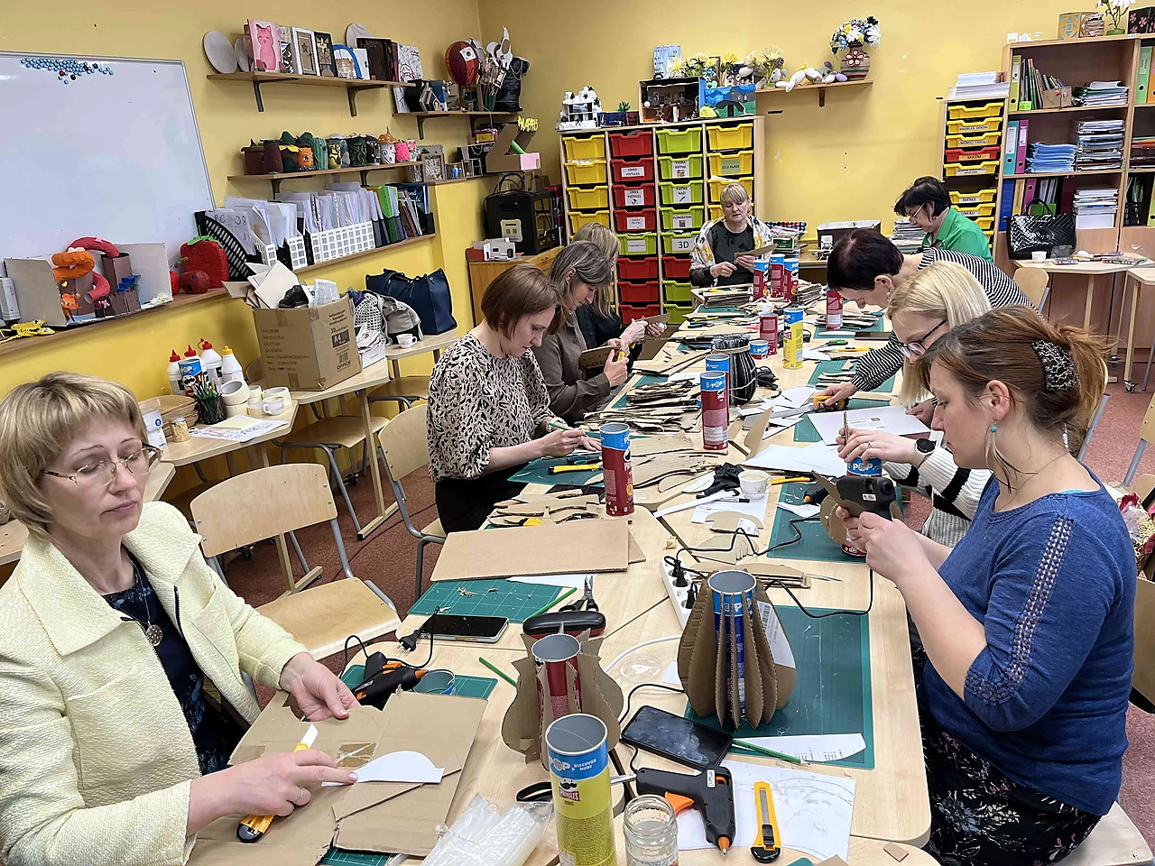Meistarklasē piedalījās 14 pedagogi, un katrs veiksmīgi izveidoja savu Lieldienu vāzi.