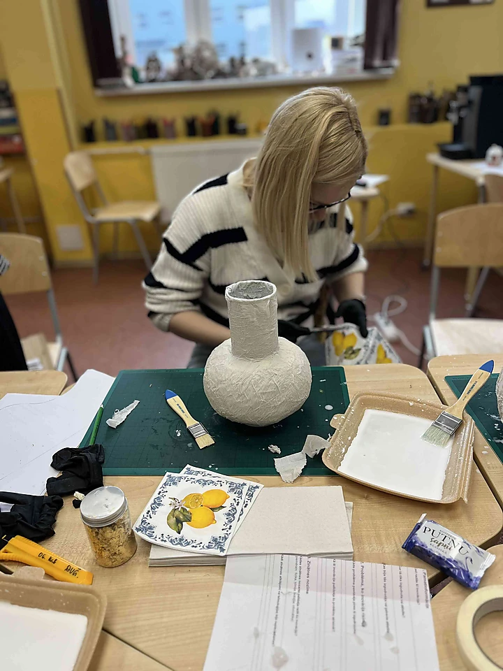 Meistarklases mērķis bija iepazīstināt pedagogus ar praktisku pārradīšanas uzdevumu, kurā no “Pringles” čipsu iepakojuma tika veidota funkcionāla vāze. Dalībnieki analizēja, kāpēc ikdienas iepakojums bieži ir grūti pārstrādājams dažādu materiālu kombināciju dēļ un kā dizaina pieeja ļauj pagarināt materiāla lietošanas laiku. Meistarklases laikā tika veikta ideju skicēšana un konstrukcijas plānošana, izvērtēta izstrādājuma stabilitāte un drošība, izvēlēti apdares risinājumi, kā arī apspriesta praktiskā lietošana, piemēram, ieliktnis ūdenim vai stikla trauks, lai objekts būtu droši lietojams. Noslēgumā notika darbu prezentēšana un refleksija par ilgtspējas ieguvumiem un iespējām līdzīgus uzdevumus izmantot skolēnu dizaina projektos.