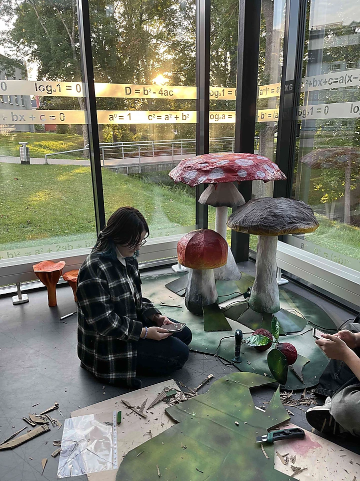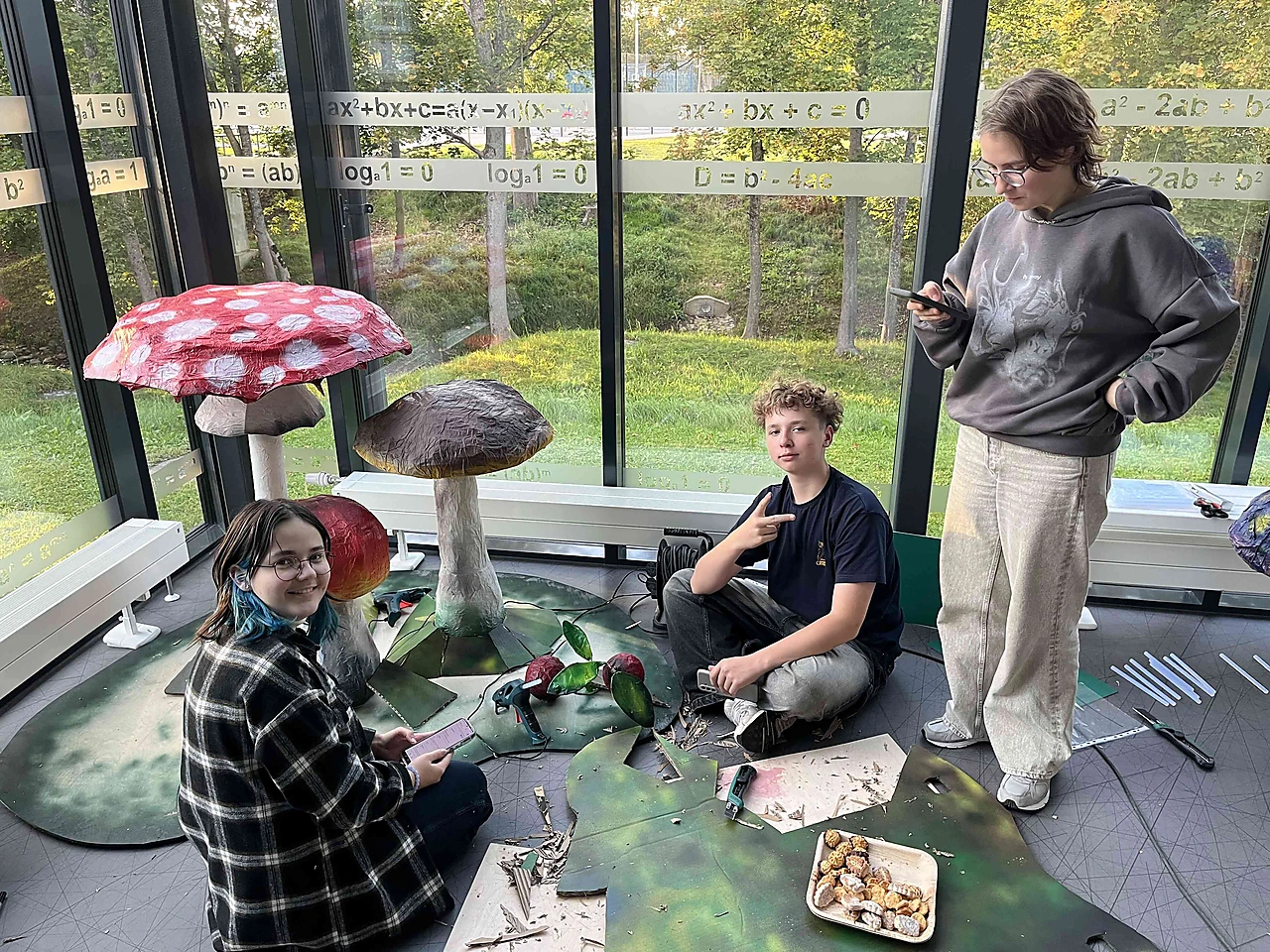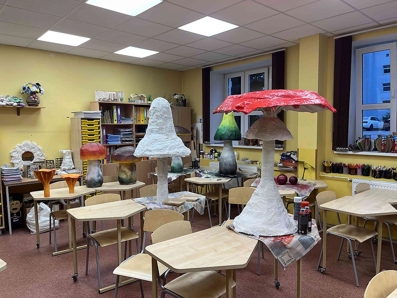 Modernās mākslas pulciņa dalībnieki septembrī radīja lielformāta instalāciju “Sēnes”. Darbs tapis no otrreizējiem materiāliem – kartona un žurnāliem, kas sākotnēji bija paredzēti izmešanai. Projekta mērķis bija attīstīt radošu pieeju materiālu pārstrādei un veicināt vides apziņu.