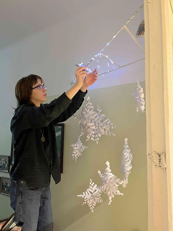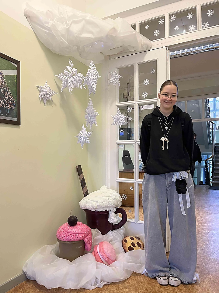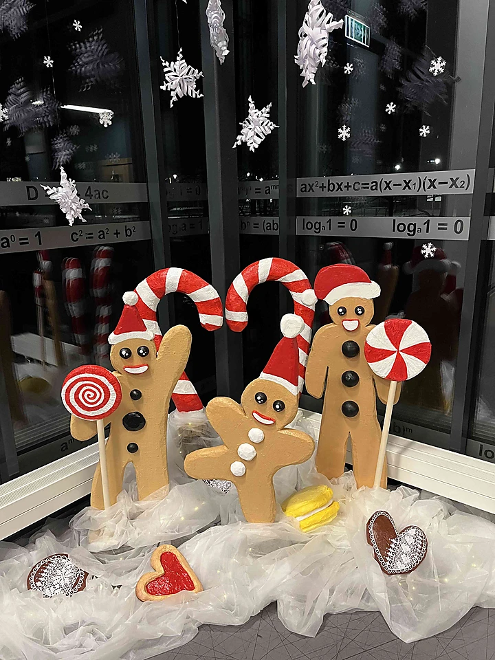 10.U klase radīja skolā īstu sniegputeni, izrotājot katru logu ar sniegpārslām, savukārt 10.V klase parūpējās par 3D sniegpārslām, kas skaisti rotāja skolas telpas.10.I klases skolēni veidoja piparkūku eglītes skolas palodzēm.