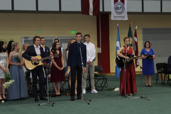 Sarīkojuma noslēgumā absolventi Rēzija Granta, Jānis Tomass Preiss un Guna Una Jāzepa svinīgi nodeva 11. klašu skolēniem ģimnāzijas karogu. Izskanēja kopīgi dziedāta skolas himna.