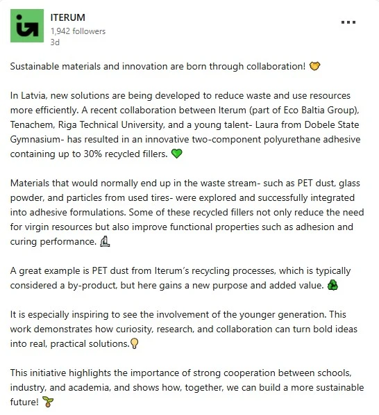 Sadarbībā ar uzņēmumiem “Iterum”, “Tenachem” un Rīgas Tehnisko universitāti tika izstrādāta jauna divkomponentu poliuretāna līme, kuras sastāvā līdz pat 30% veido pārstrādāti materiāli. Īpaši nozīmīgi ir tas, ka šie materiāli ne tikai samazina nepieciešamību pēc jauniem resursiem, bet arī uzlabo produkta īpašības.