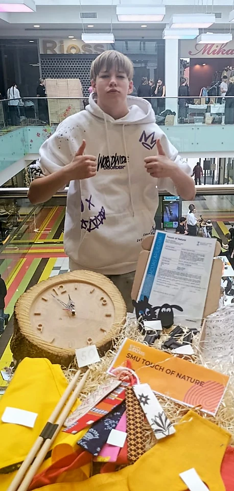 "Touch of nature" ražo dažādus koka izstrādājumus, kā piemēru direktors prezentēja paša izgatavotu dabīga koka pulksteni.