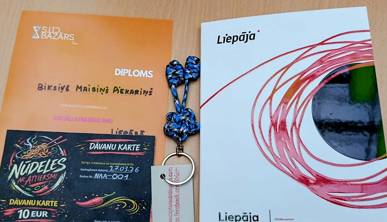 "Biksiņš, Maisiņš, Piekariņš" prezentēja dabā pašu atrastas 2. Pasaules kara patronas pārveidotas par piekariņiem un SMU direktora Aksela Simkina šūtās somas no otreizlietojamiem džinsiem.